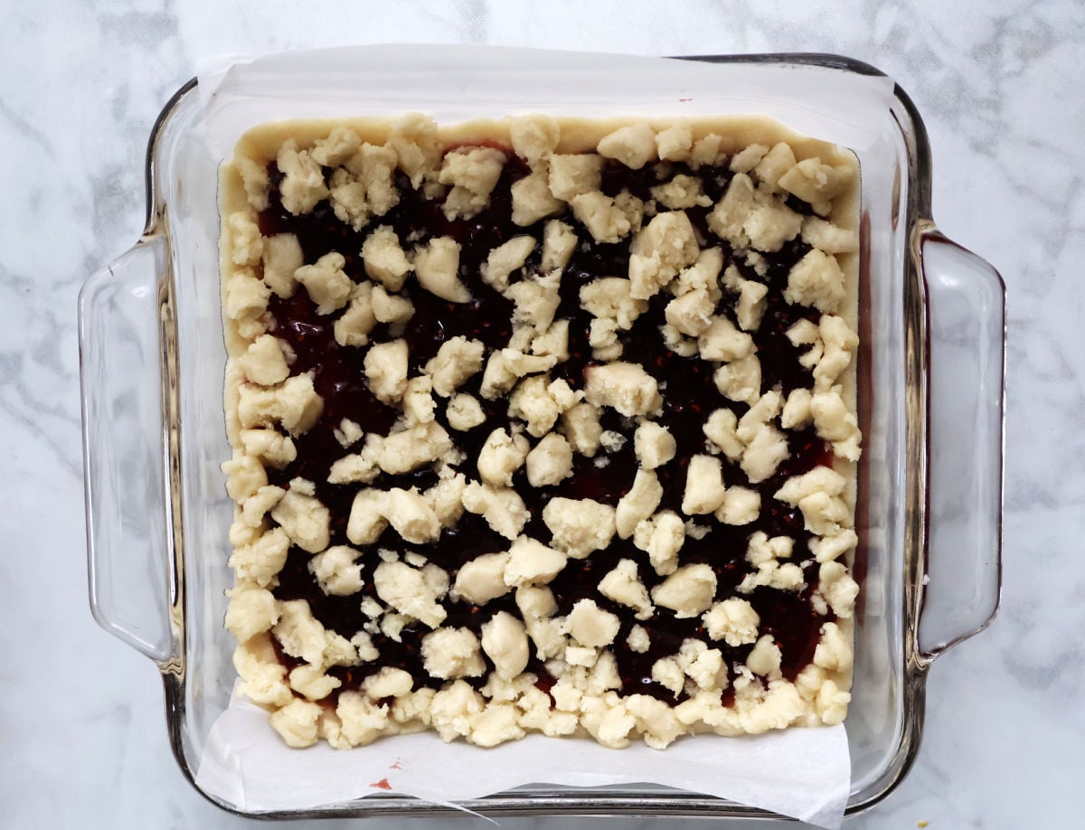 The cookie dough forms both the crust and crumble topping, while the jam bakes into a bright raspberry filling. No mixer, no measuring cups, and no complicated steps.