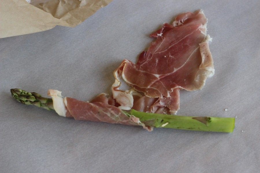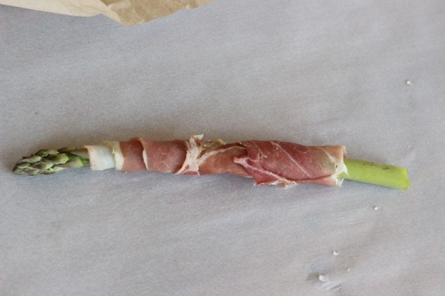Start wrapping under the tip part. If your Prosciutto falls apart, it's ok! Just keep rolling it around your stalk. When ready to place in the oven, an optional light drizzle of olive oil helps roast these evenly.