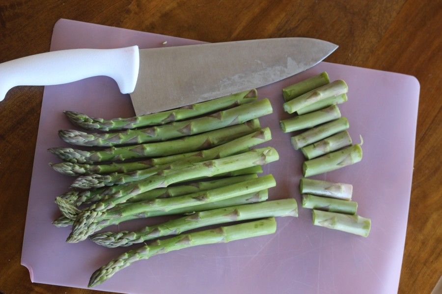 - Trim hard stalks off bottom of asparagus