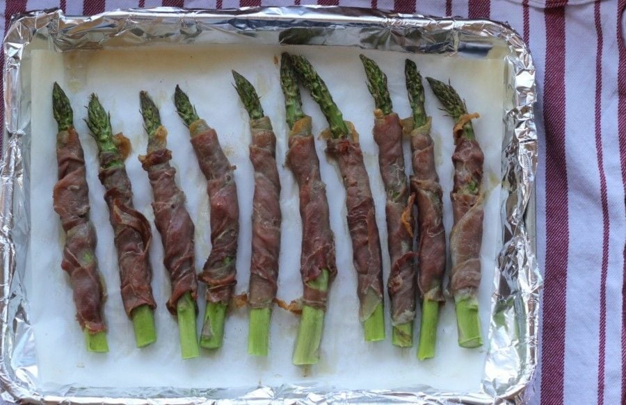 Place in a 450ºF preheated oven for approximately 10 minutes. Cooking time can vary a minute or two because your asparagus stocks are thick. The asparagus will be nice and green, and the prosciutto will look cooked and crunchy.