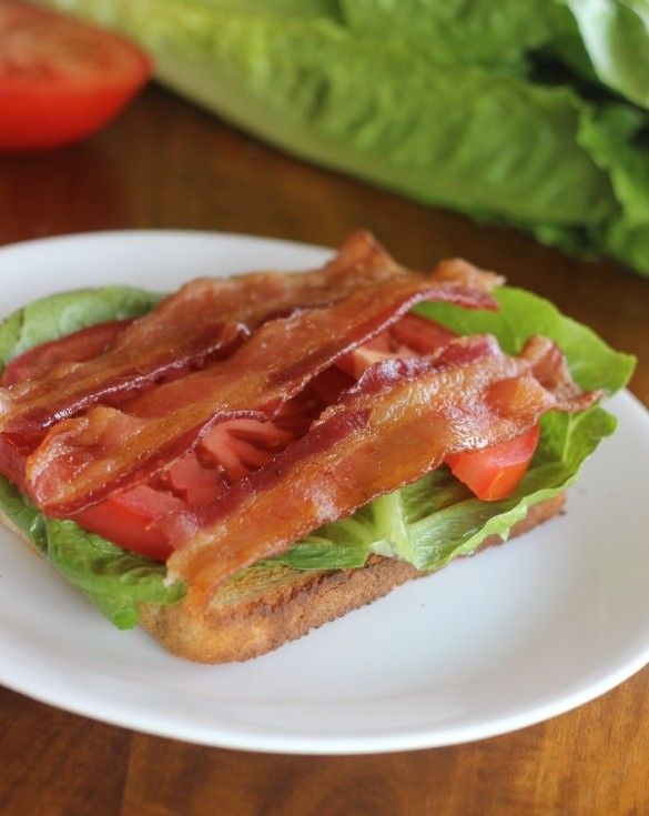 - Layer the lettuce, tomato and bacon on top of the slice of bread.