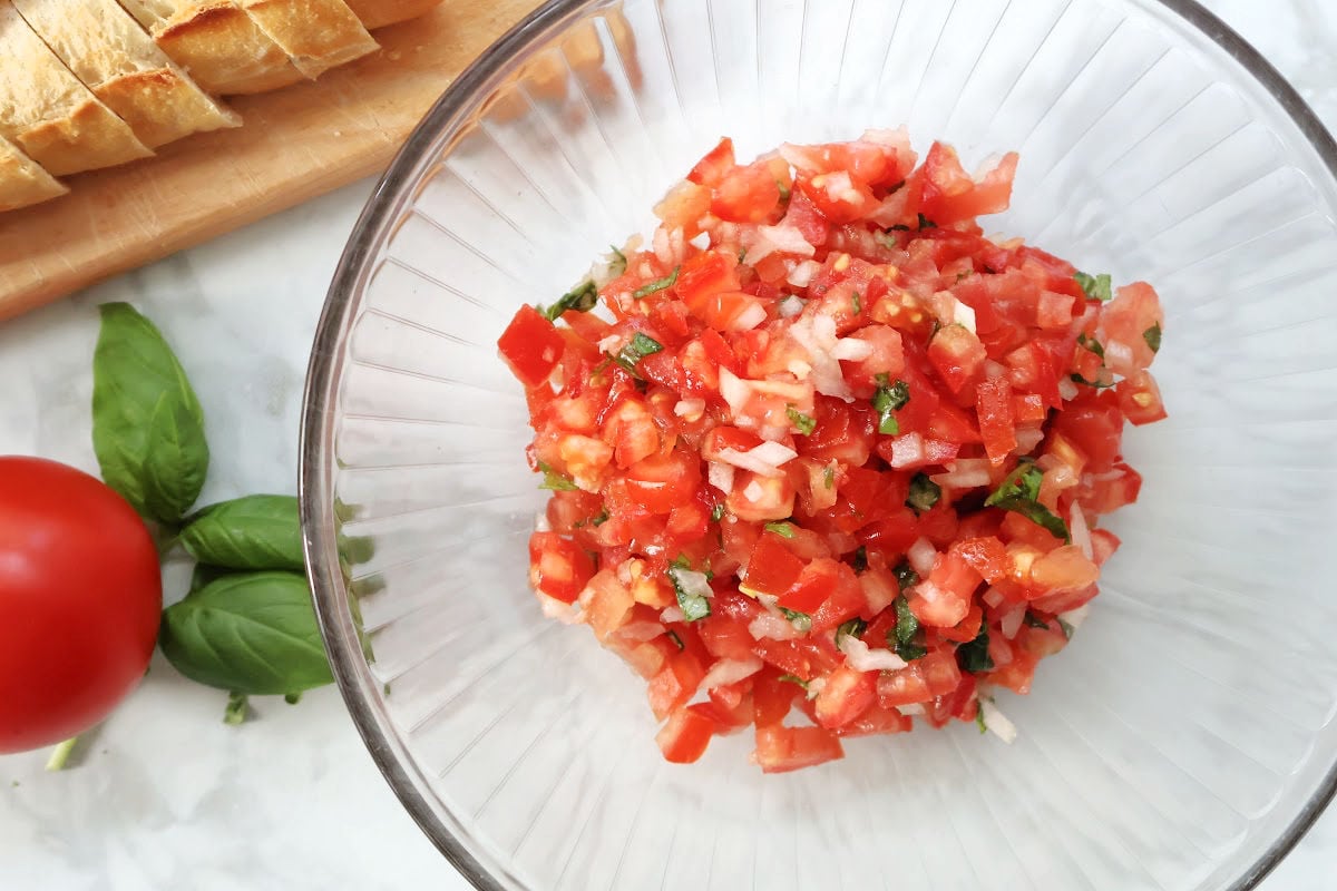 - In a bowl, mix diced tomatoes, minced garlic, chopped basil, olive oil, and a pinch of salt. Add parmesan if using. Stir gently to combine.