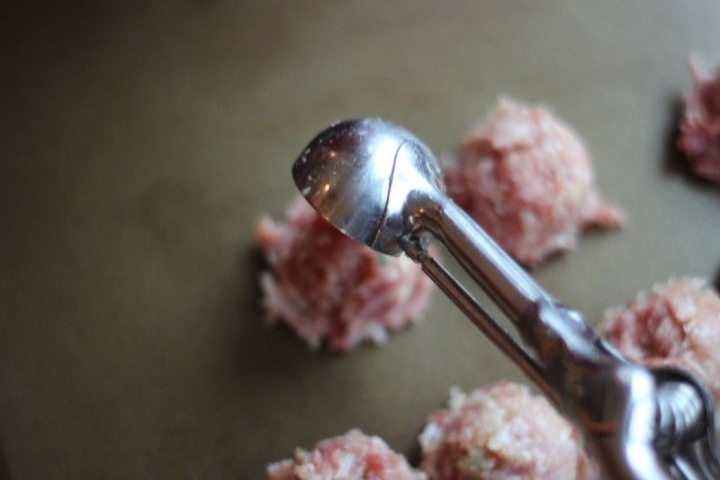 Once all ingredients are mixed, figure out a way to make consistently sized meatballs. I have a ¾ inch cookie scoop and that's what I use. I scoop the meatball mixture into rough balls with it.