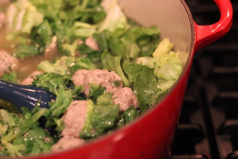 Add escarole to broth and meatballs. Simmer approximately another 10 minutes. You can check 'doneness' by making sure the thicker pieces of escarole are tender.