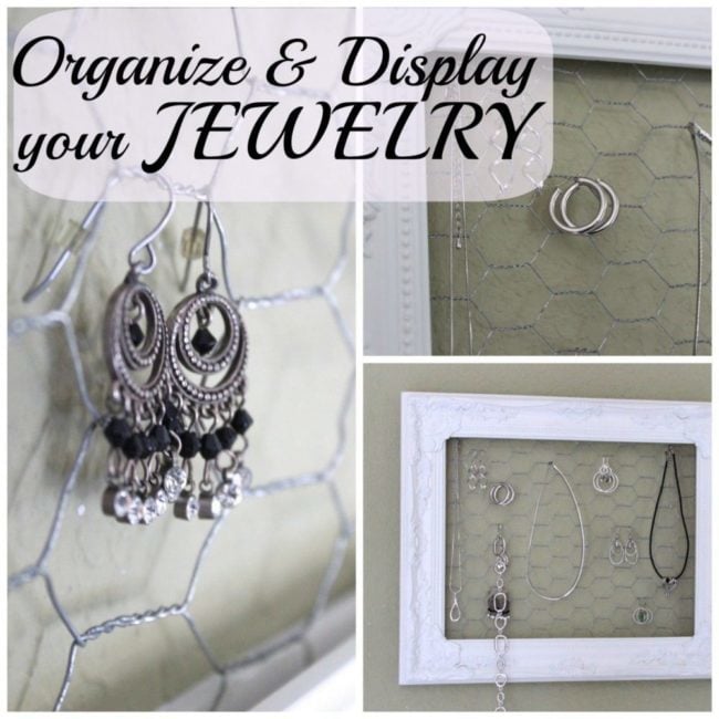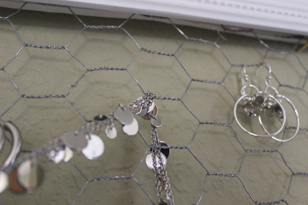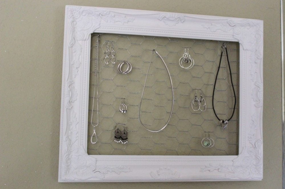 A couple of weeks ago, one of my friends wanted to figure out a way to organize her necklaces. She wanted them handy and visible. With a defined place so her jewelry looked like it was supposed to be in that particular space. I tried for a while to figure it out, and couldn't come up with a solution. Lucky for Lori, I had my TV to HGTV and saw a frame with chicken wire that had a family's Christmas cards displayed. Bingo! This gave me the inspiration to try my project! Here is what I created and how I now display and store my everyday jewelry.