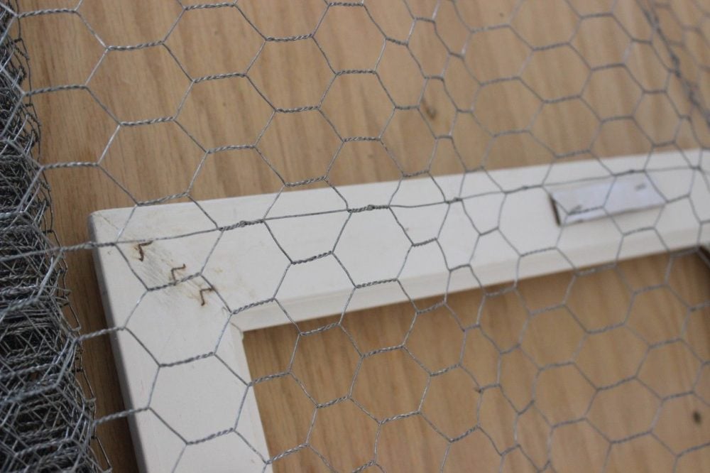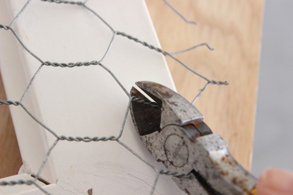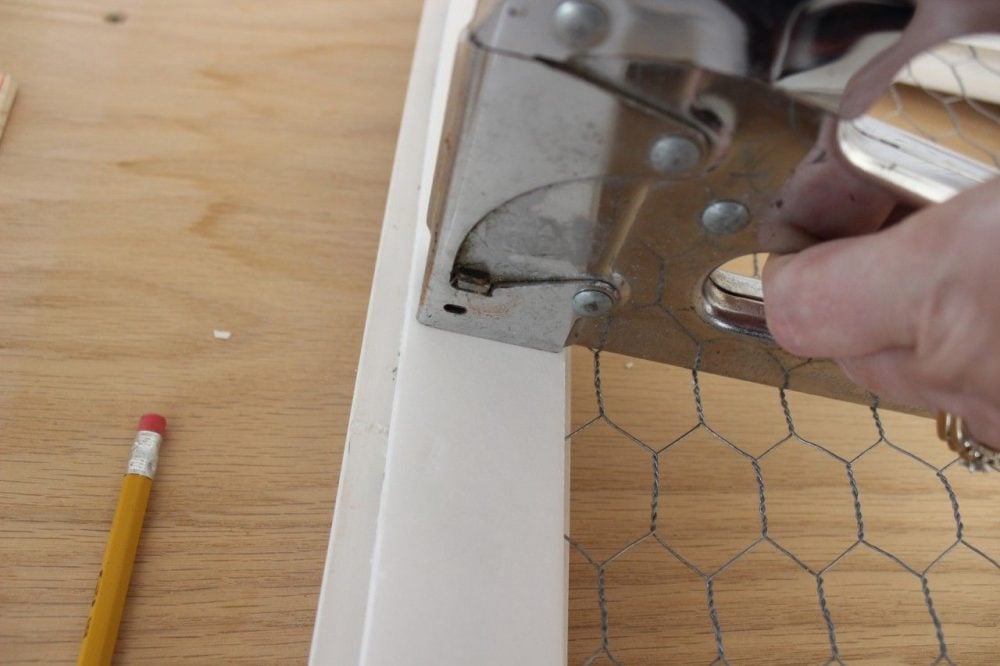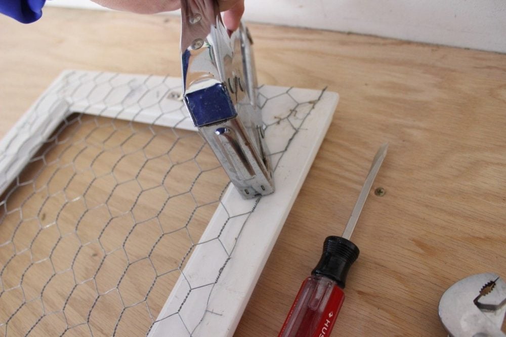 Please ignore the rust on my tool. Use a good quality stapler to attach the chicken wire to the back of the frame.