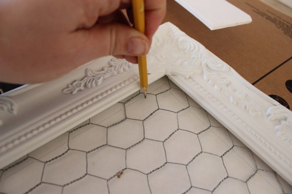 Supply List: 1. Frame with an opening the size you want (I used a frame that was 18x15 with a 16x13 opening) 2. Chicken wire (doesn't everyone have chicken wire in their garage??) 3. Wire cutters 4. Heavy duty stapler (my desk stapler didn't do the job) 5. Foamboard or cardboard to cover the back of the frame Instructions: Unroll the chicken wire and measure to fit the back of the frame. I've noticed some craft stores sell pieces of chicken wire. Saw some in Hobby Lobby last week.