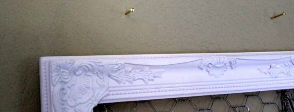 To hang it up, I nailed two nails into the wall about 10 inches apart (inside of my frame is 13 inches). I wanted to be able to easily take the frame off so I could organize my jewelry and then hang it up. Don't worry, the nails don't show when the frame is hanging. Most frames have that lip that hold in the mat so all is good!
