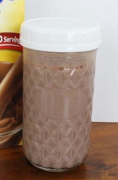 I put the powdered drink in the jar, fill it about ⅔ full of milk and add some ice cubes. Leave about an inch from the top so you can shake the mixture up. The ice cubes do a great job mixing the powder.
