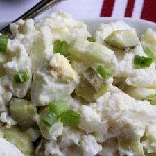 This potato salad is also easy to make. It requires just a little bit of chopping and mixing, and it all comes together quickly. I remember helping my Mom make this for so many family meals while we were growing up!
