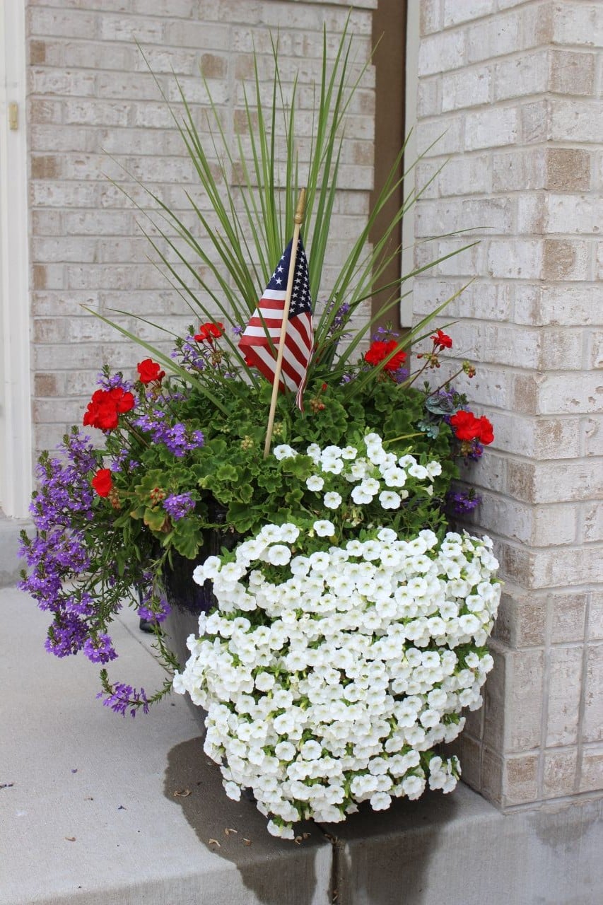 Red geraniums are often used as the "red" when planting a red, white and blue theme! Having planters with this color theme helps if you decorate for Memorial Day, July 4th, and Labor Day.