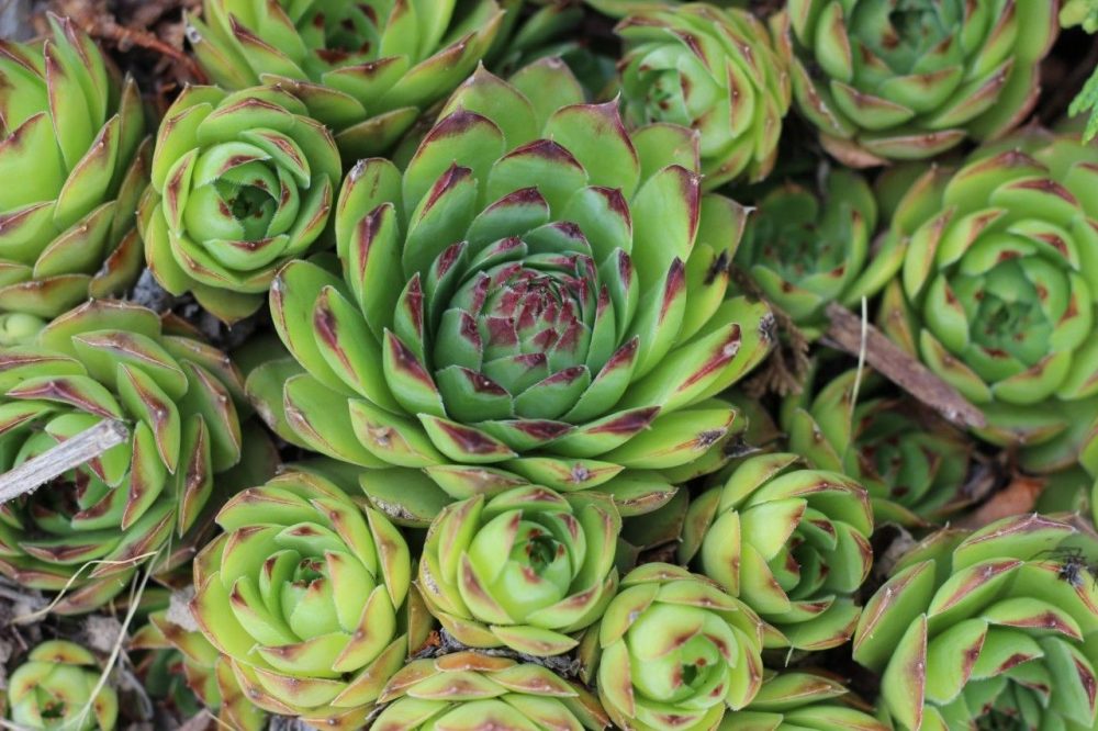 Basically, I planted lots of hanging/trailing type plants. I added some hens n' chicks just because I love them! And they look so good in strawberry pots when they start growing and multiplying.
