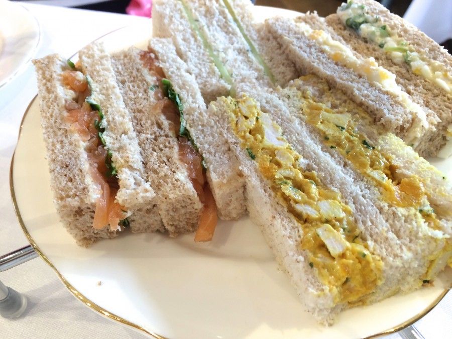 Here we are having tea. With fancy sandwiches, baked goods and, of course, scones.
