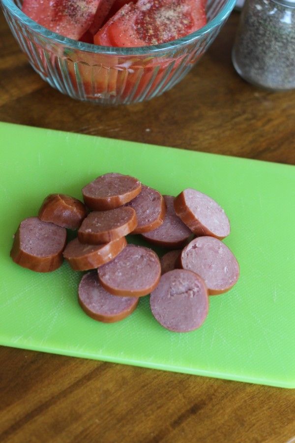 - Cut a 3 inch (approx 3 oz) piece of kielbasa into coins