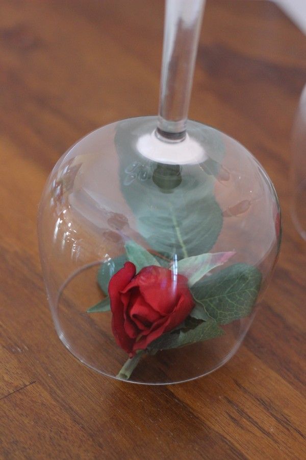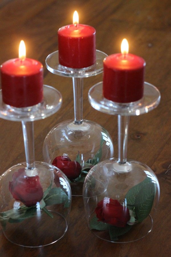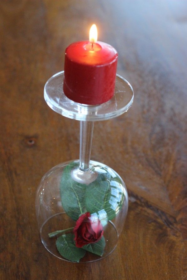 A red rose under the wineglass and a red candle. It really doesn't get simpler than that! And, you can just use what you have! Honestly, I have a set of wine glasses that I use just for these types of centerpieces.