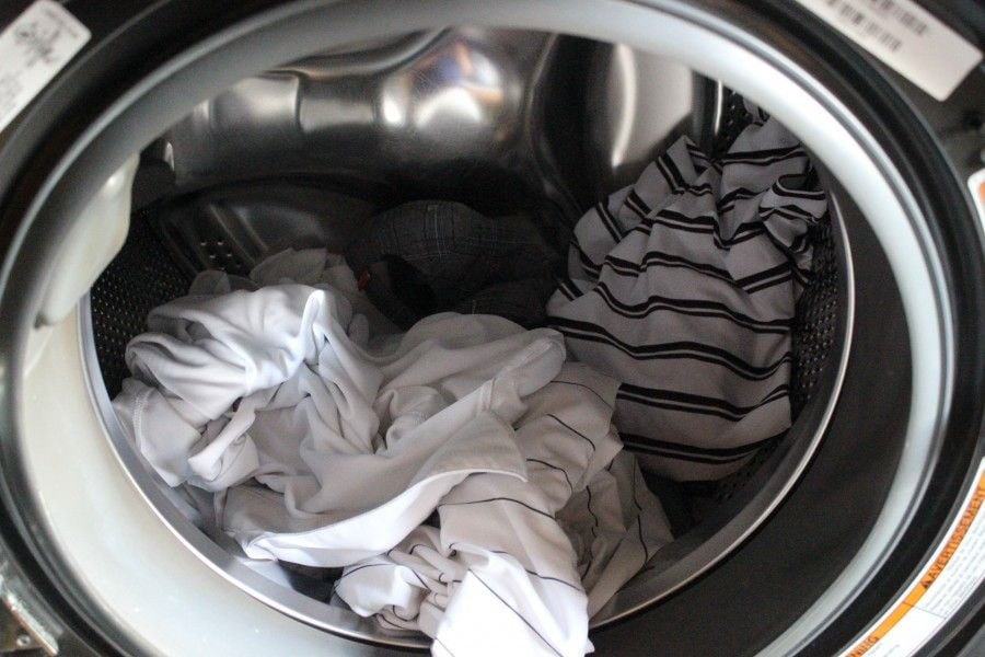 After they are all sprayed, let them sit for 5 minutes and then toss them in your washing machine.